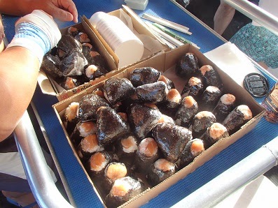 お昼も遠足気分でおにぎりとBBQ&サシミ~~!!